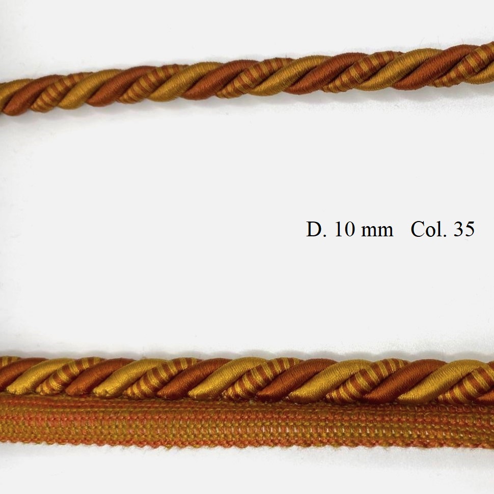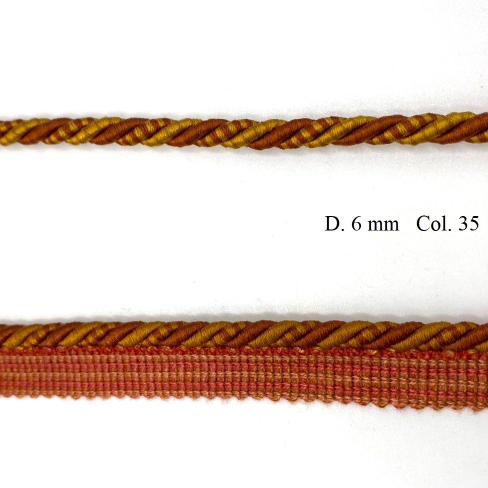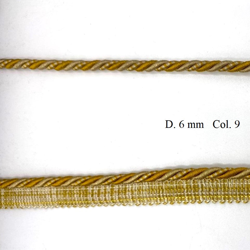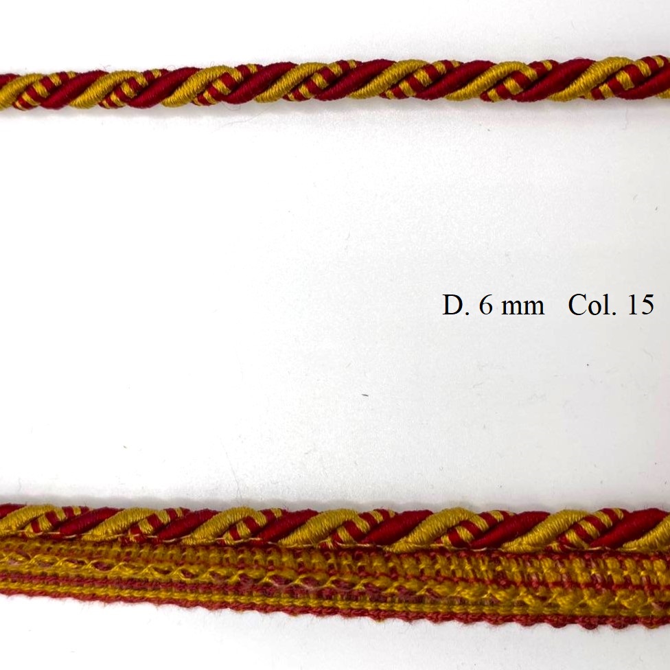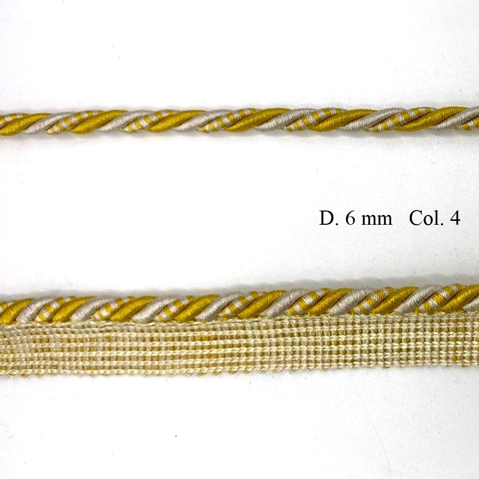 Cordone cordonetto bicolore per passamaneria, di diametro circa 6 mm e 10 mm.