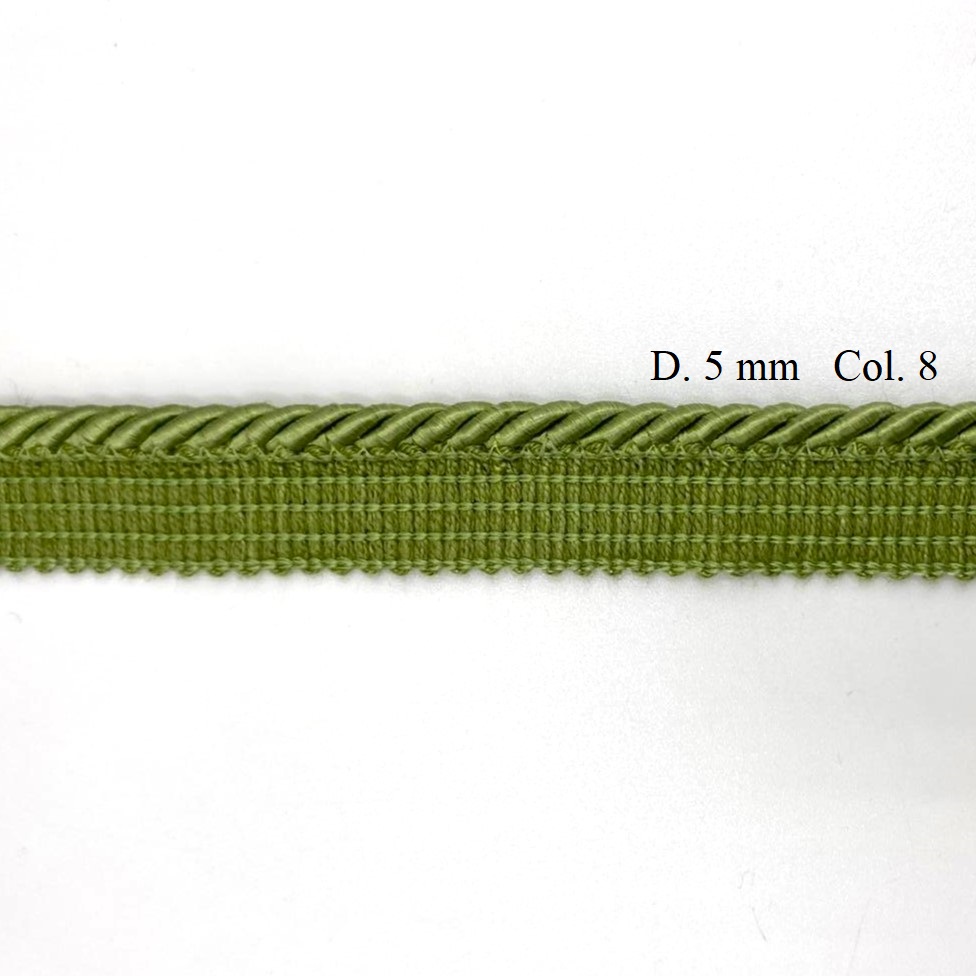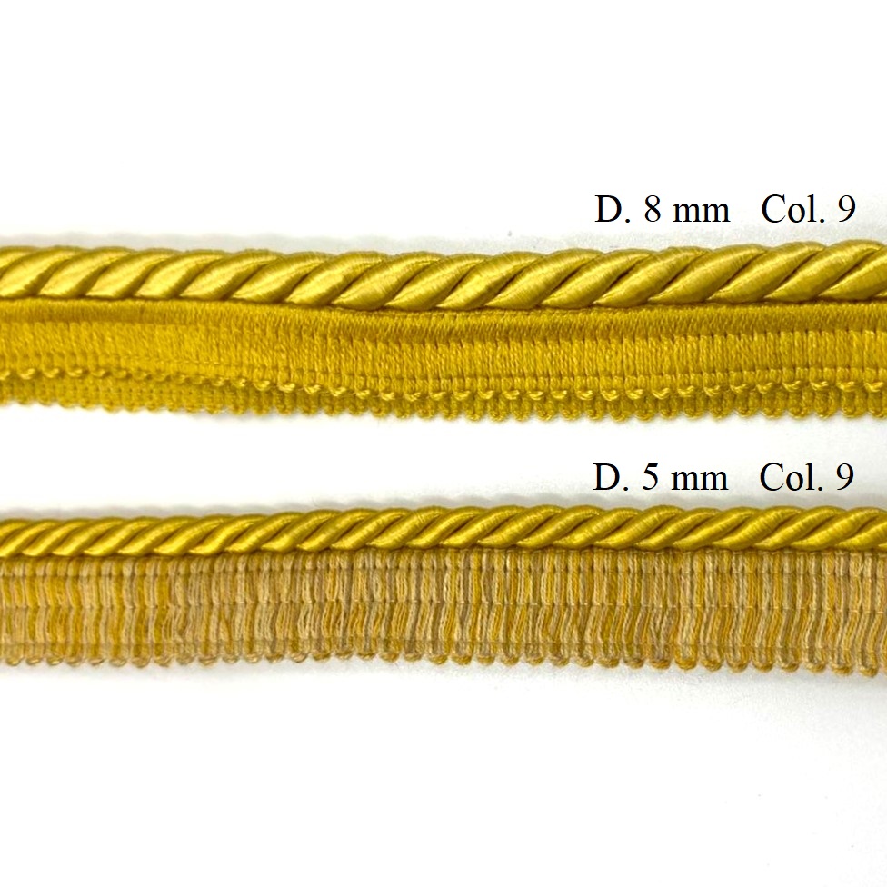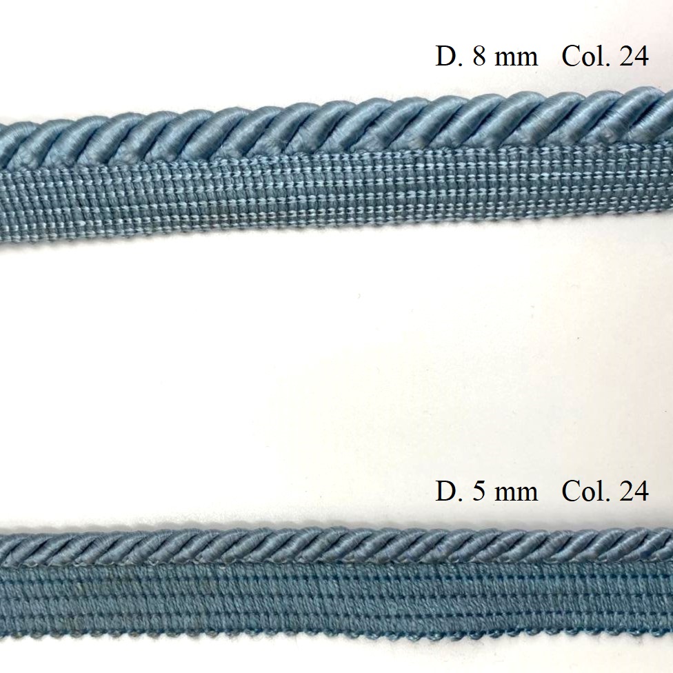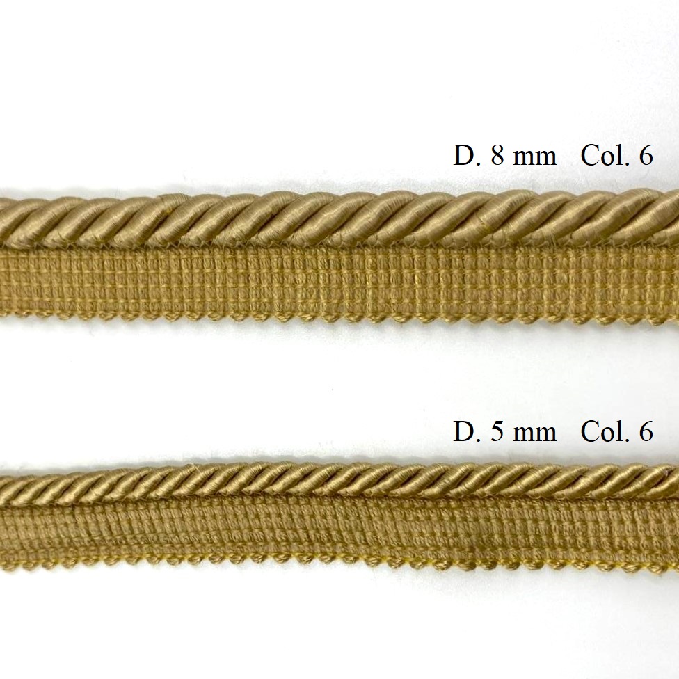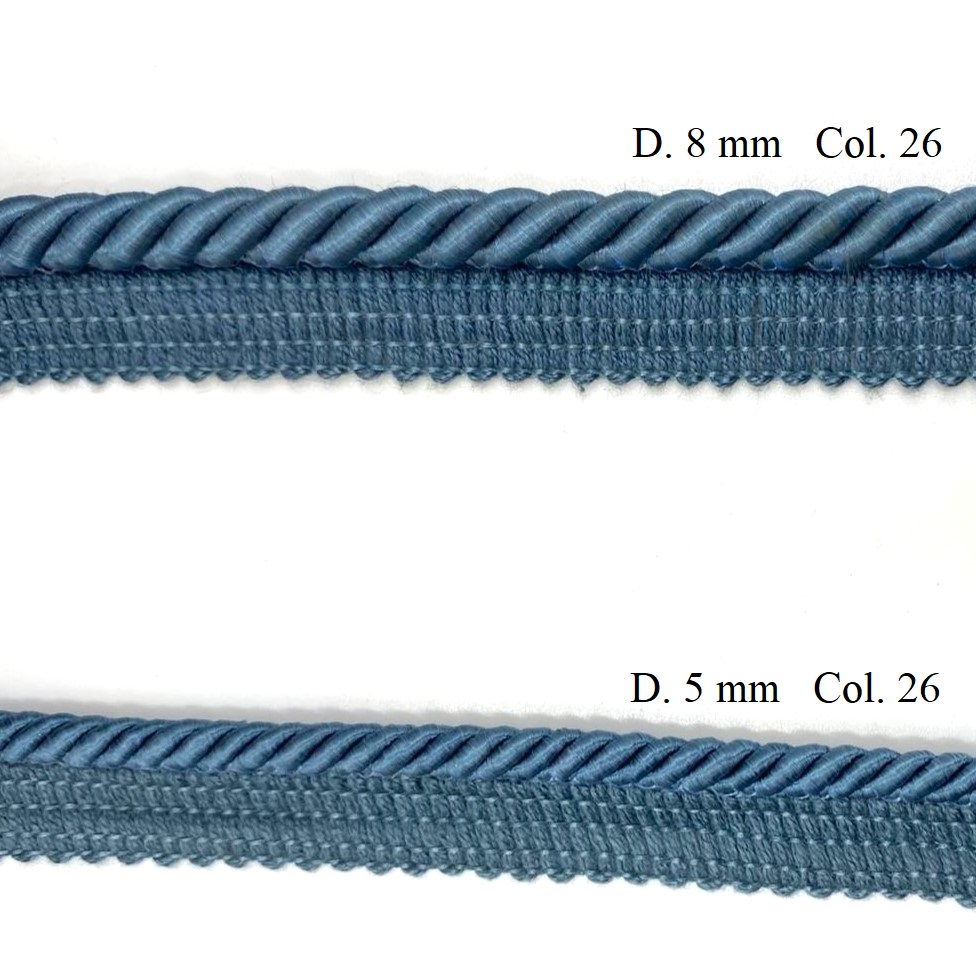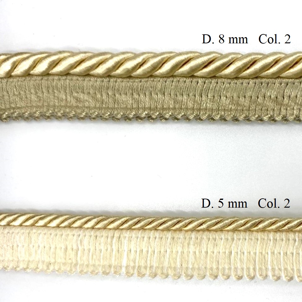 Cordone in rayon con fettuccia per passamaneria, di diametro circa 5 mm e 8 mm.