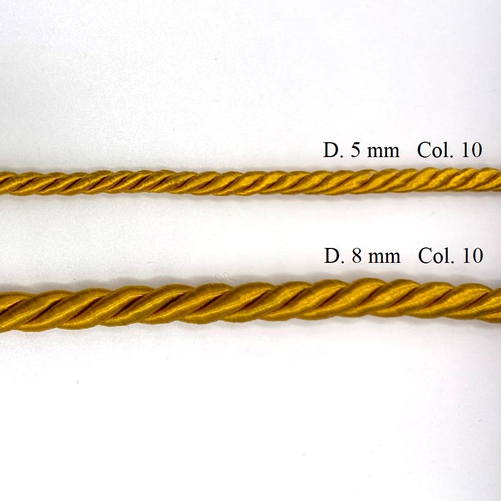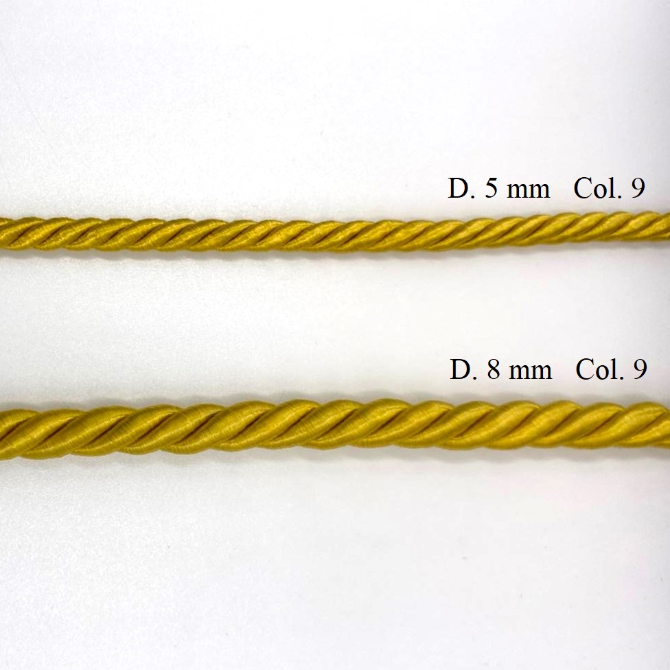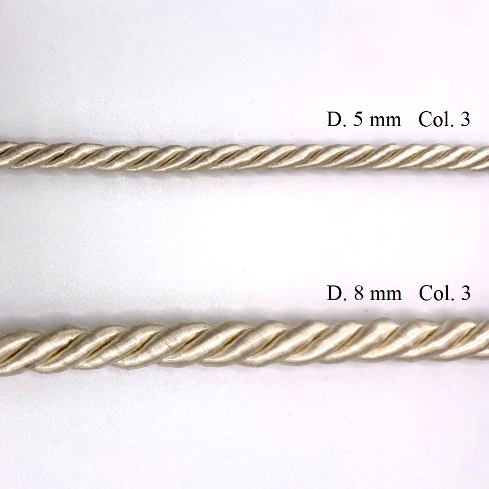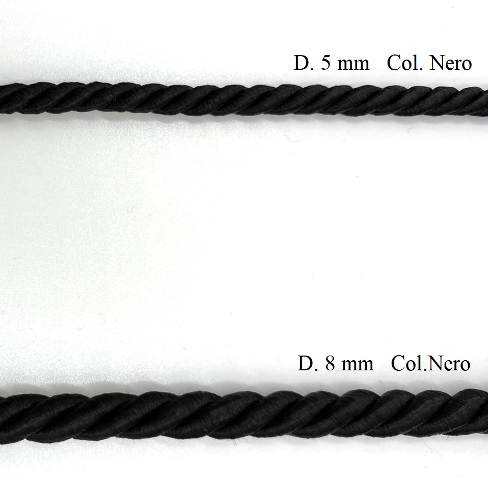 Cordone in rayon per passamaneria, di diametro circa 5 mm e 8 mm.