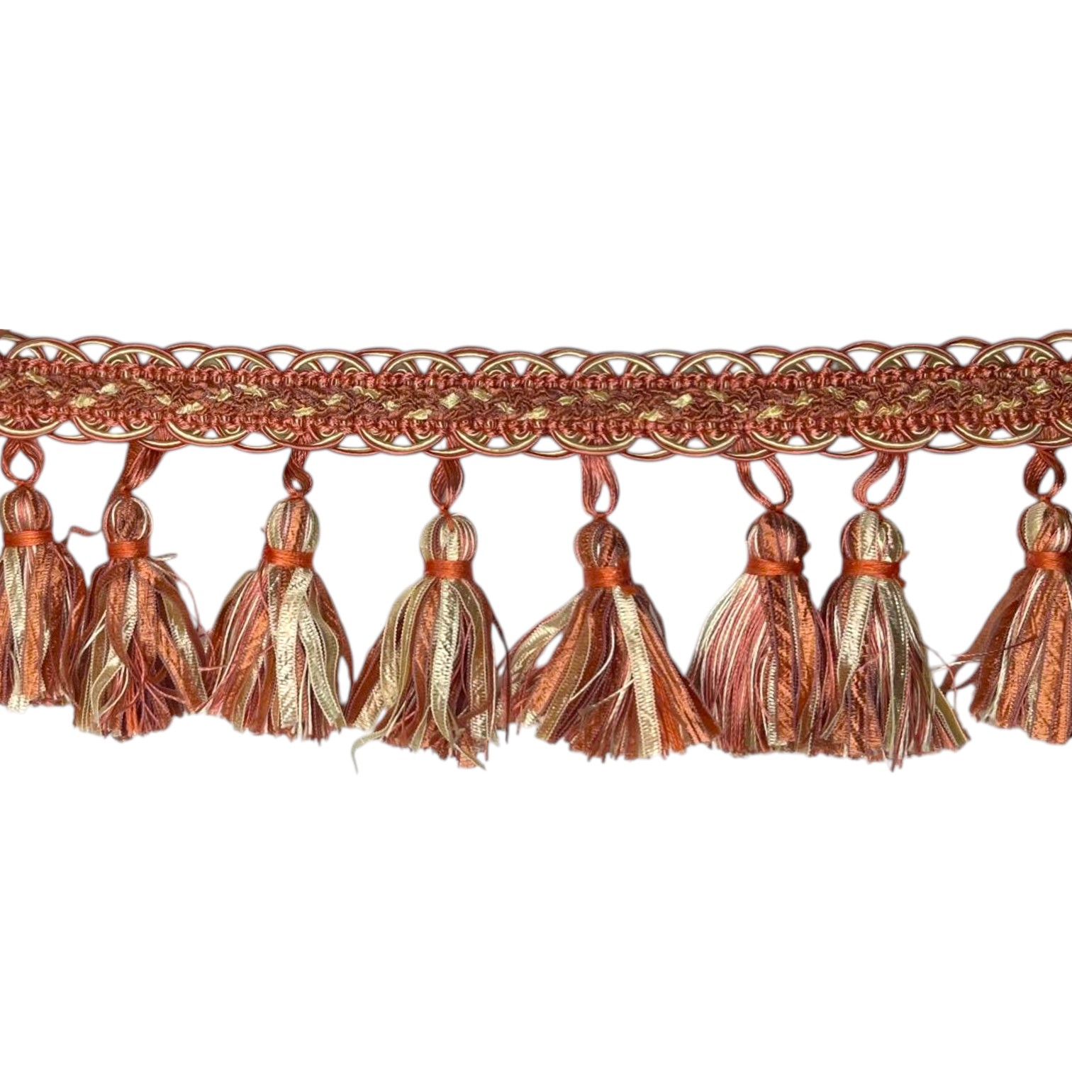 Frangia con bordo lavorato e fiocchetti rosa e panna, di circa 8,5 cm ed è utilizzata per la passamaneria.