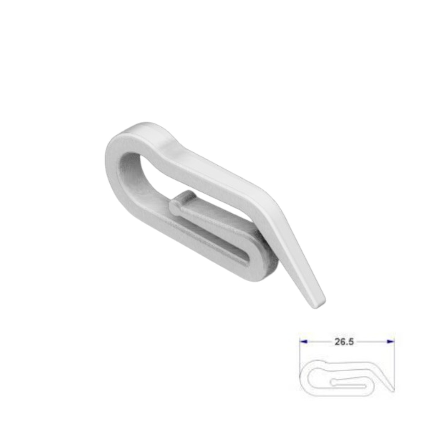 Gancio proboscide modello Brescia lungo per nastri tenda, in poliacetalica e lunghezza 26,5 mm.