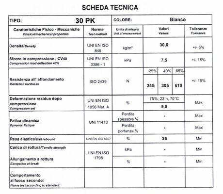 Gommapiuma densità 30 PK bianca, rigida e indeformabile. Utilizzata per realizzare cuscini di sedie, panche, poltrone e divani..