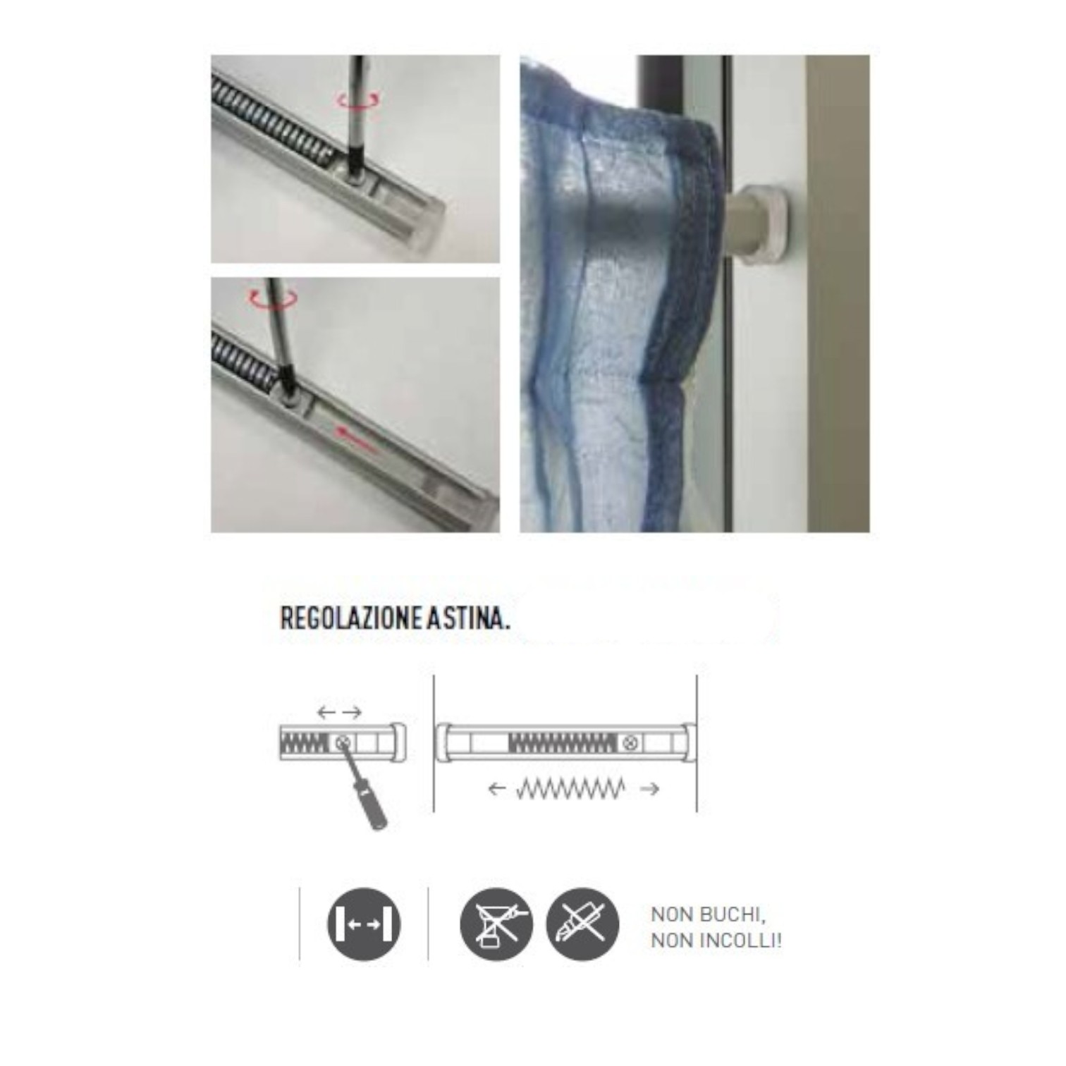 Guidatenda a molla color argento con fissaggio a pressione, senza bucare o incollare. Lunghezza variabile da 27 cm a 40 cm.