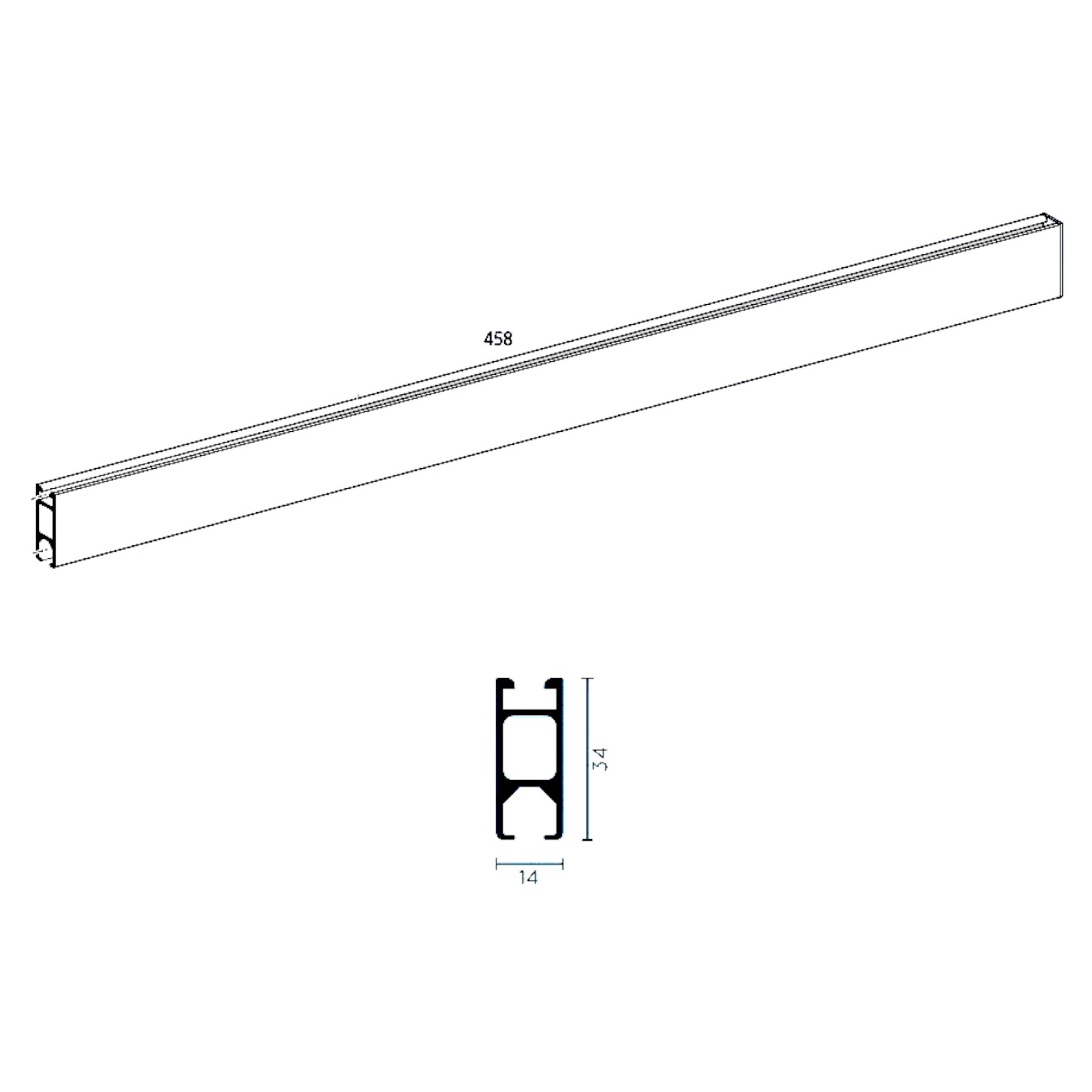Profilo in alluminio Mottura modello Separè 458 di dimensioni 14 x 34 mm, utilizzato per sistema per tende arricciate ad uso separazione ambienti. Articolo 458.
