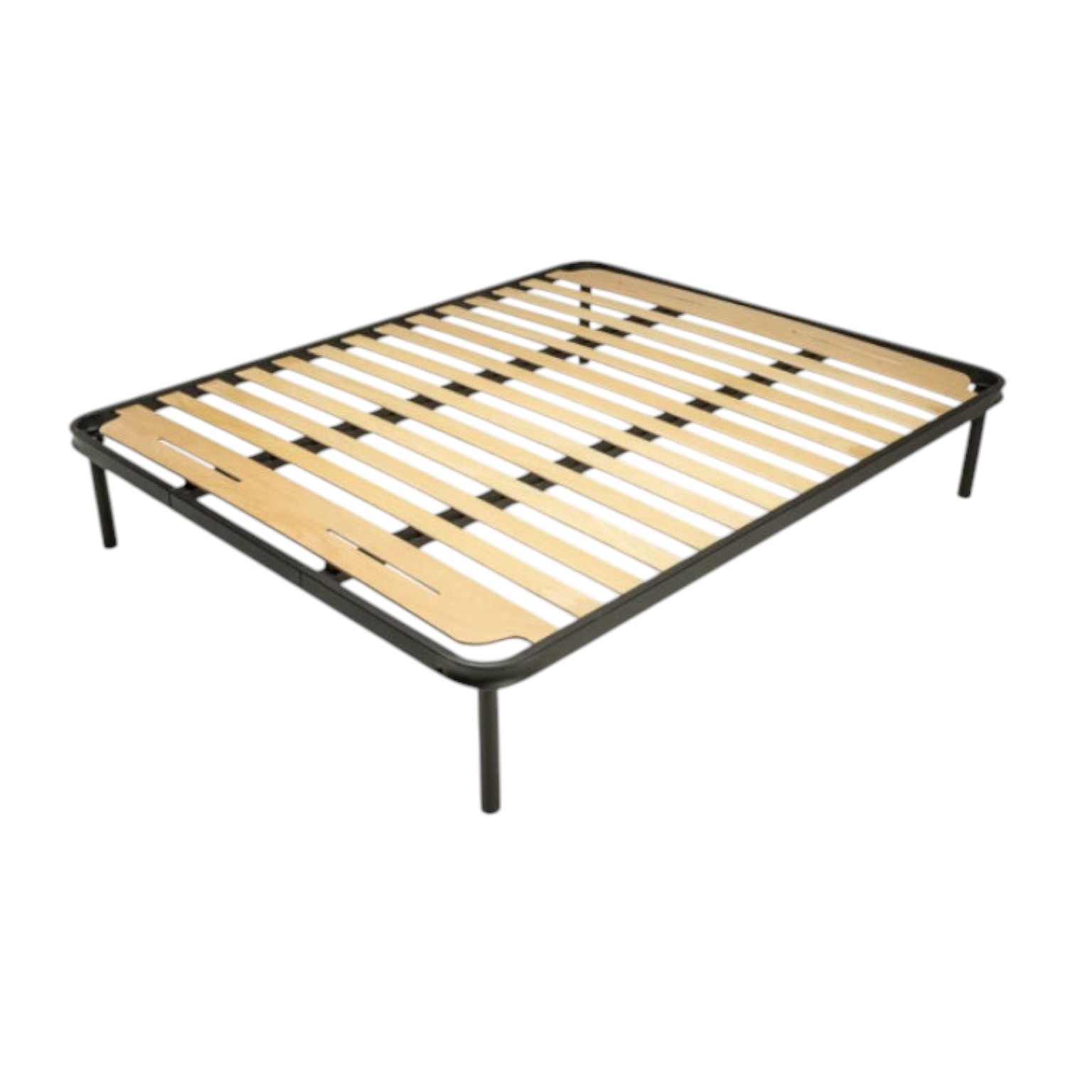 Rete in ferro fissa a doga stretta. Telaio in tubolare semiovale 50×25 mm, sagomato e asolato per inserimento doghe con guarnizioni anticigolio in polipropilene incassate direttamente nel telaio. Piano rete con doghe in multistrato di faggio 170×8 mm curve fino alla larghezza di 90 cm e piane per misure superiori. Zampe di serie in tubolare tondo maggiorato, diametro 40 mm, altezza 30 cm.