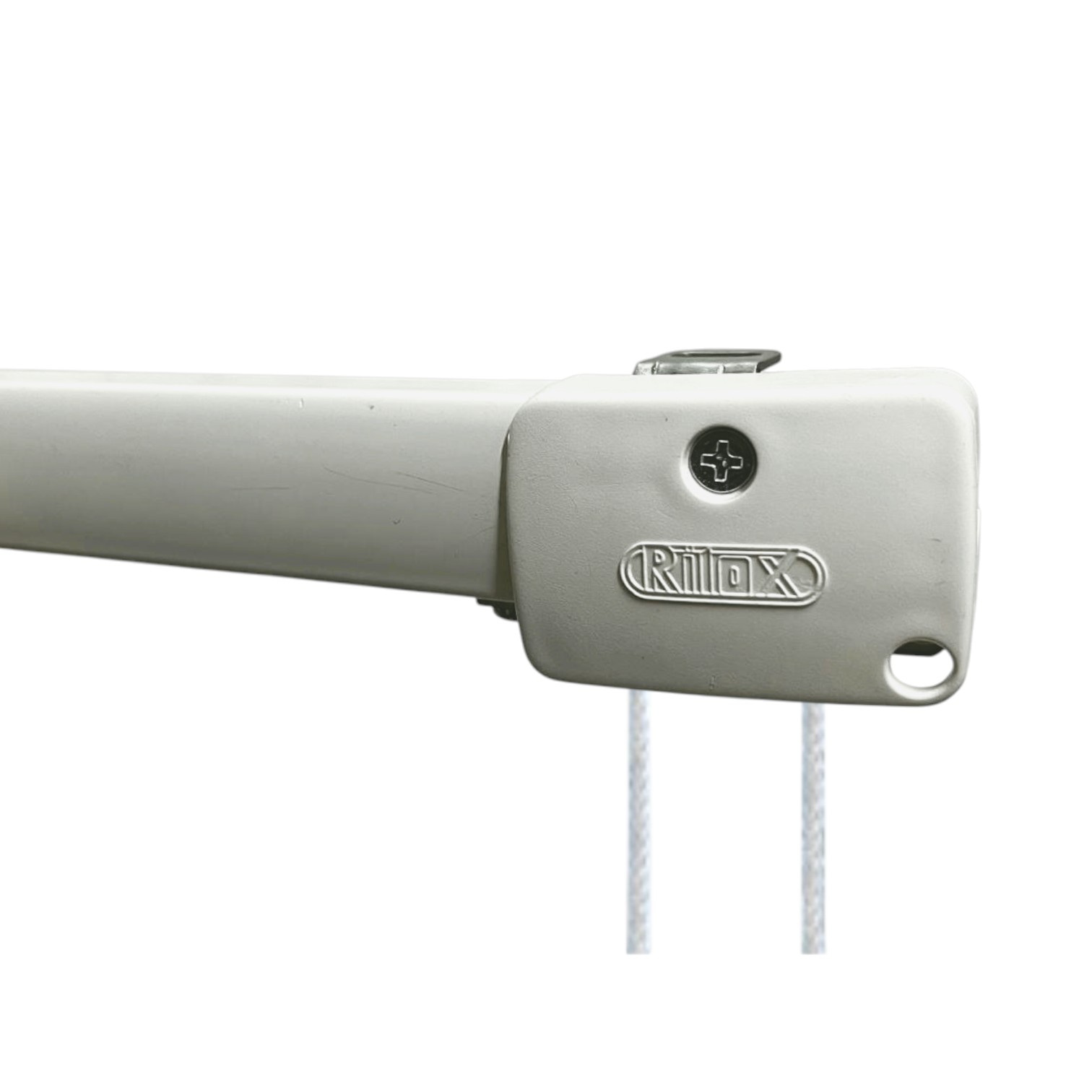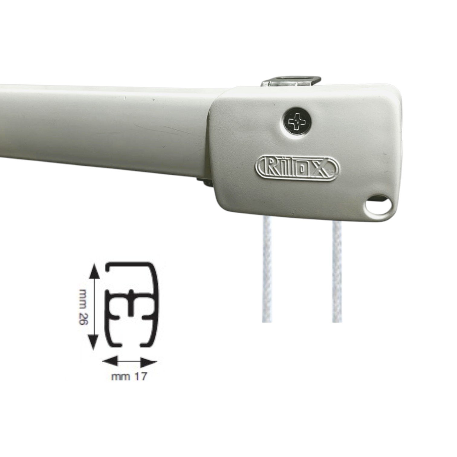 Sistema in alluminio Rilox modello Euro colore bianco, per tende arricciate con azionamento a corda. Indicato per installazioni a soffitto. L’apertura può essere centrale o laterale (a destra o a sinistra).