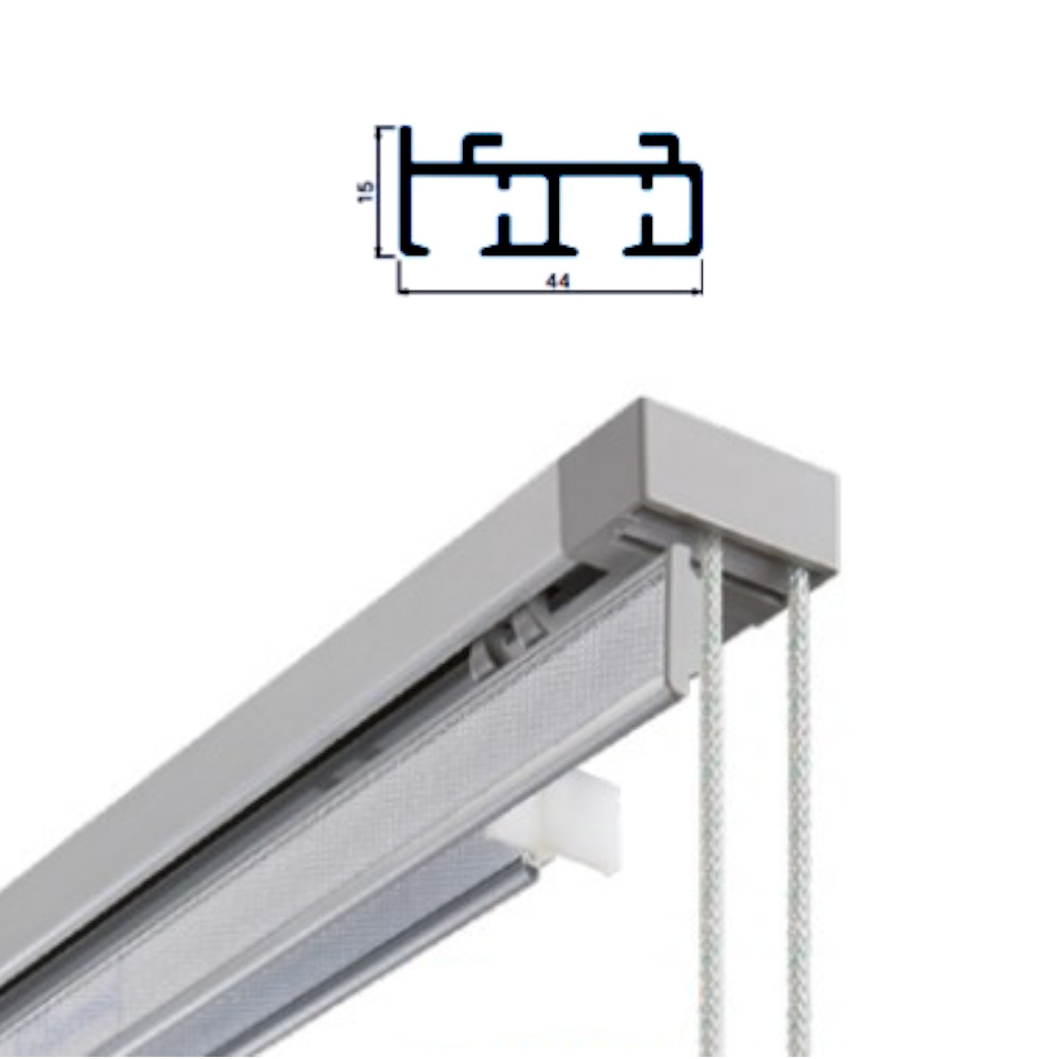 Il sistema è indicato per tendaggi di lunghezza massima 600 cm ed altezza massima 330 cm, di peso non superiore a 1,5 kg per pannello. Dotato di profilo in alluminio bianco di dimensioni 44 x 15 mm e peso fondotenda da 4 x 40 mm.