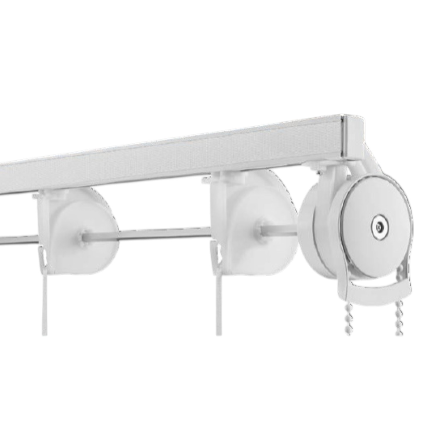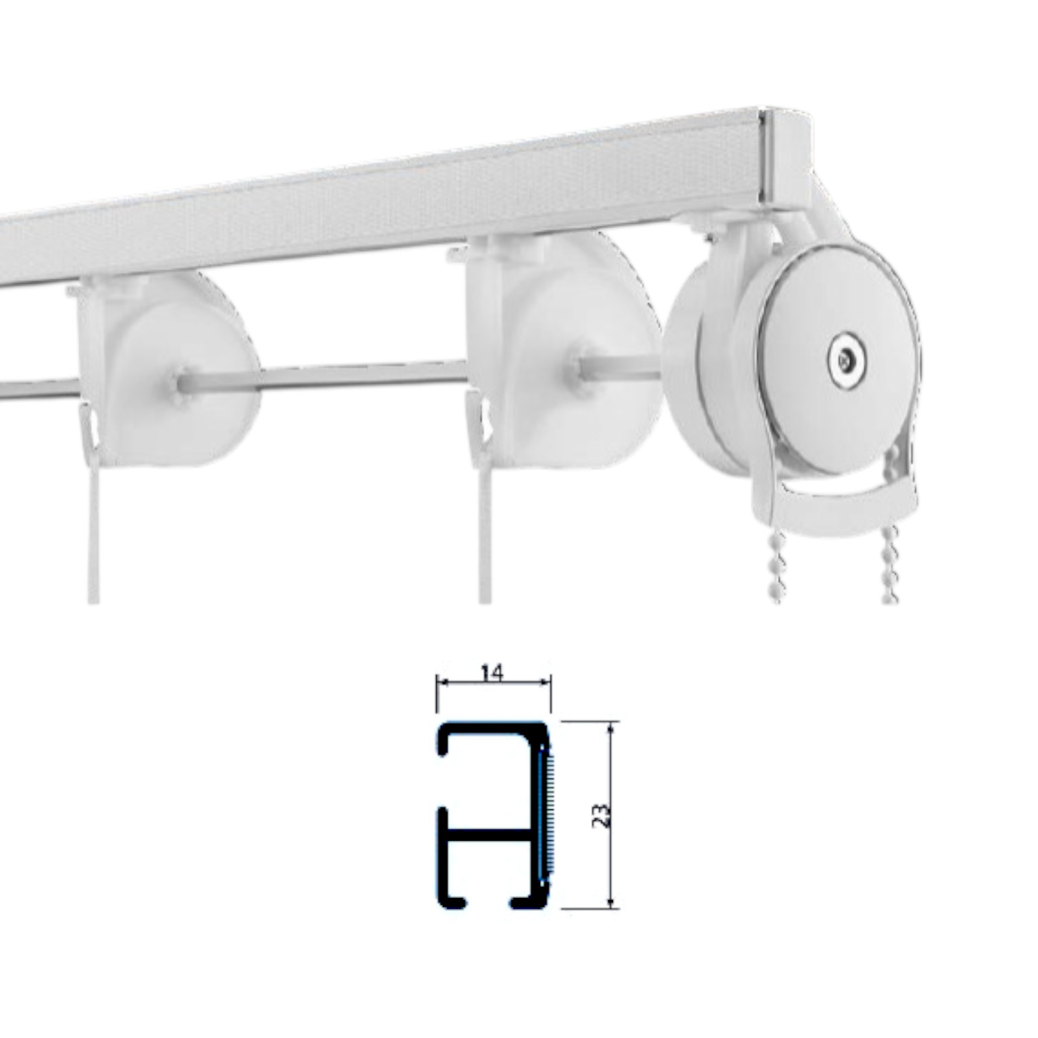 Sistema Mottura Rotary 444 per tende a pacchetto con azionamento a catenella, utilizzato per ambienti domestici o professionali. Indicato per tendaggi di lunghezza massima 400 cm e altezza massima 350 cm, peso non superiore a 1,7 kg. Il sollevamento avviene tramite rocchetti avvolginastro azionati da un meccanismo a frizione su cui si agisce tramite una catenella che determina il posizionamento della tenda. I rocchetti avvolginastro sono dotati di sgancio per la rapida rimozione della tenda. Dotato di profilo velcrato in alluminio bianco di dimensioni 14 x 23 mm e peso fondotenda da 4 x 40 mm.
