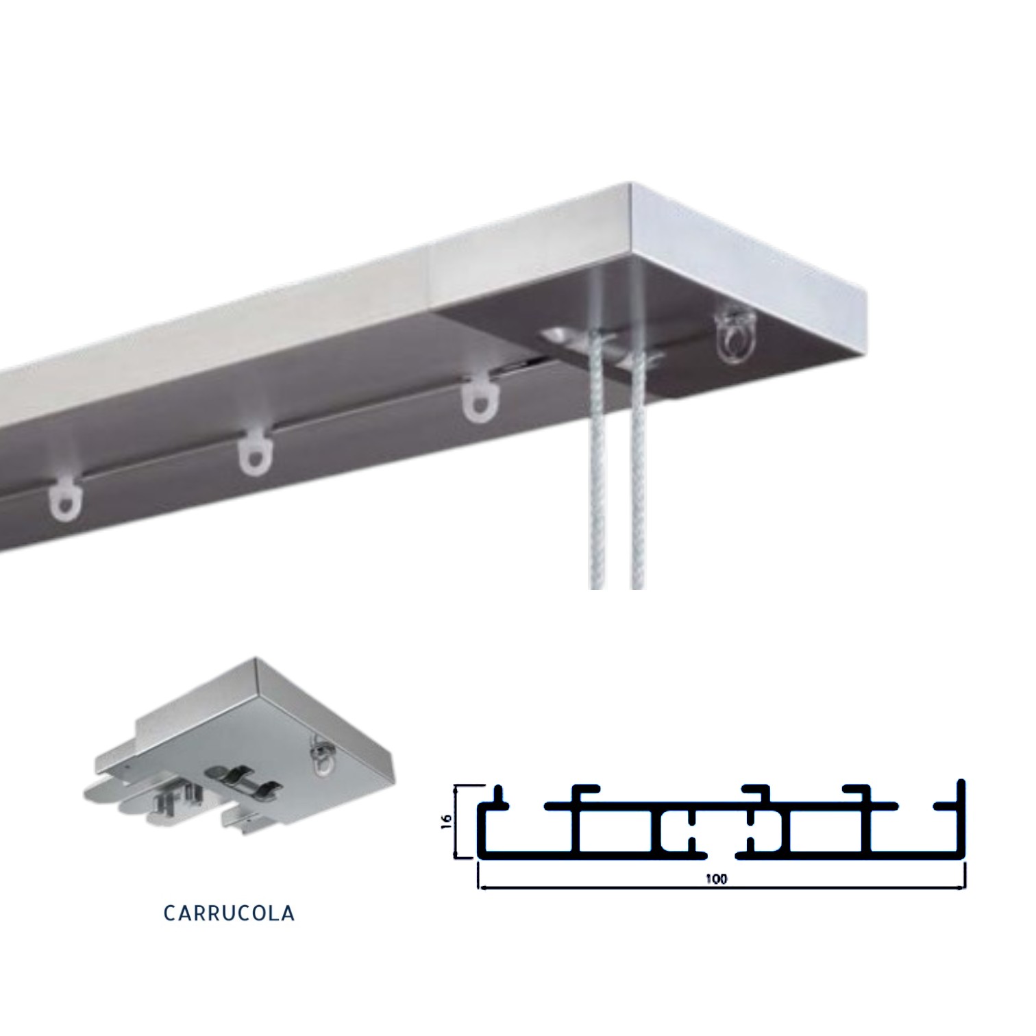 Sistema Mottura modello Stralys con azionamento a corda, di dimensioni 100 x 16 mm. Utilizzato per tende arricciate ad uso principalmente domestico o per ambienti professionali. Indicato per tendaggi di lunghezza massima 600 cm, altezza massima 300 cm e peso non superiore a 5 kg. Installazione a soffitto.
