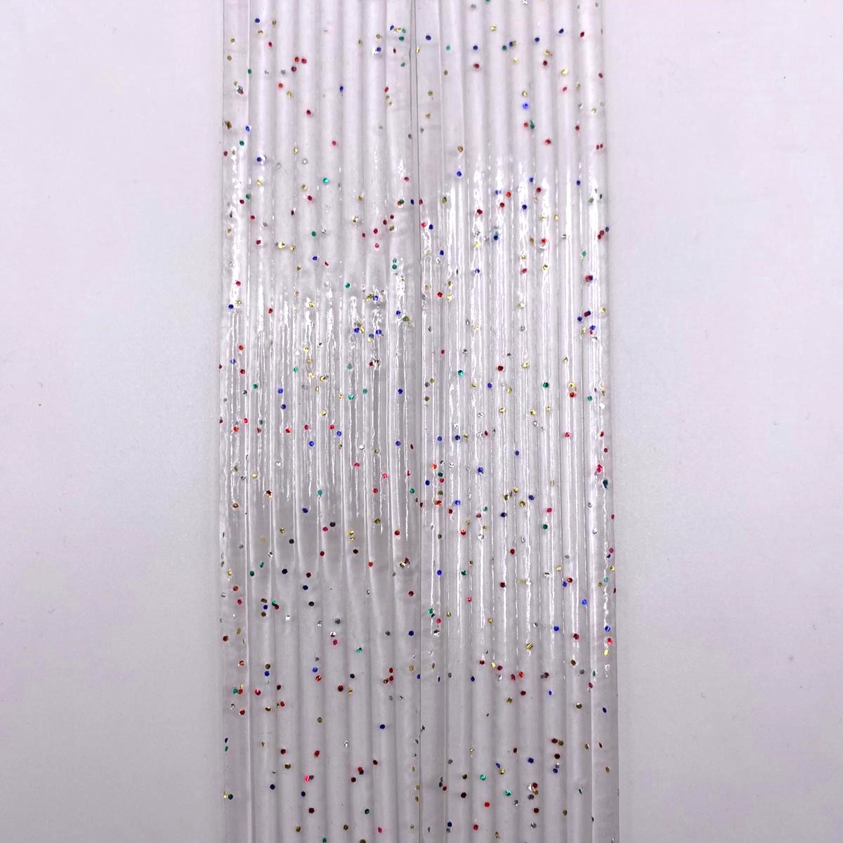 Tenda antimosche per uscio modello piattina in PVC di larghezza circa 4 cm, glitterata multicolor. Con possibile montaggio frontale con occhielli o a soffitto con fori passanti e viti autofilettanti.